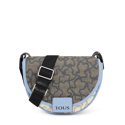 Medium TOUS half-moon-shaped crossbody bag from the Amaya Kaos Icon collection in beige canvas and finished with blue synthetic leather trim. Flap closure with metal interlocking button clasp. Inside pocket with zipper fastening and detail with embroidered logo. Long adjustable strap. Measurements (height x width x depth): 19 x 25 x 9 cm.