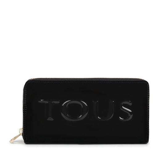 Medium TOUS Grata Dorp collection wallet in leather-effect vinyl with patent leather finish and TOUS embossed in black and beige. Zipper closure. Central compartment with zipper, eight card compartments and two flat pockets. Measurements: 10 x 19.5 x 2.5 cm.