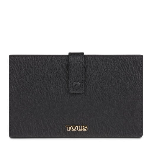 TOUS Essential medium wallet in Saffiano-effect vinyl combined with leather-effect vinyl in black. Snap button closure. Interior with 1 zipped pocket, 10 main compartments for cards and 1 large compartment for bills. Measurements: 18.5 x 13 x 2.5 cm.