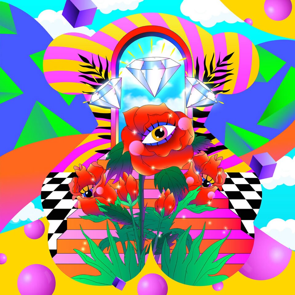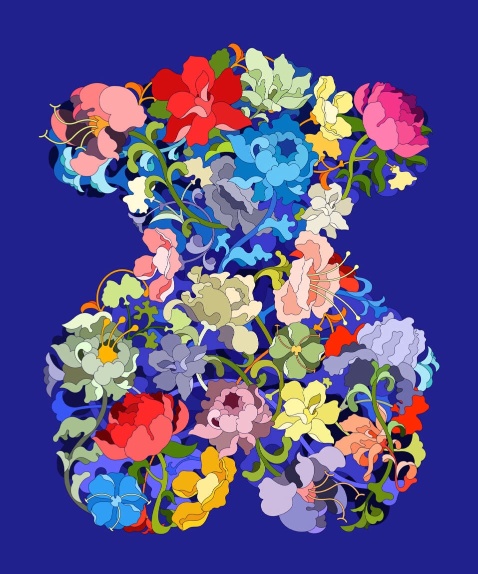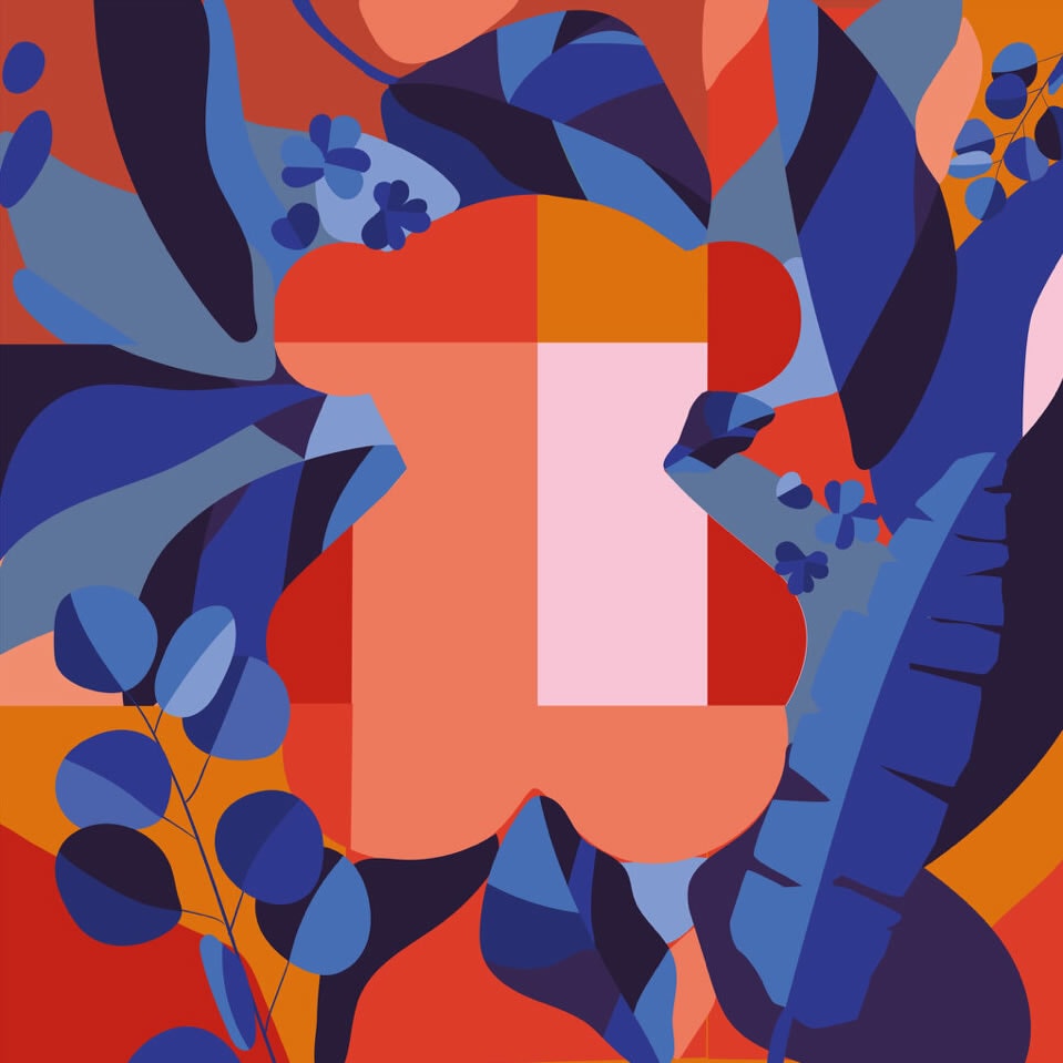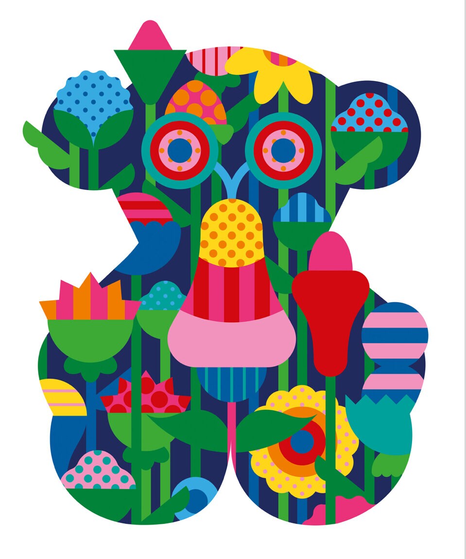“Our artwork is of a lush floral scene built from simplified geometric shapes, and executed in our signature bright and optimistic color palette. The graphic flowers are bold and abstracted, sometimes weaving in and out of the TOUS bear, giving the artwork dimension and the illusion of the illustrated world moving into the physical one.”