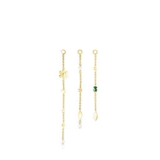 מארז פריג'ל תליונים לעגילים מורמייל צהוב ואבני חן. מארז של שלושה תליוני עגילים העשויים זהב צהוב 18 קראט על כסף סטרלינג 925 עם מוטיבים שונים, דוב בשיבוץ אבן חן מלכיט 4 מ"מ, 3 פנינים מתורבתות עגולות בקוטר 3 מ"מ. אורך השרשרת: 54.3-54.55-69.7 מ"מ. [העגיל לא כלול]. יבואן: אלפא אקססוריז בע"מ, שבילי הדפנה 4 פארק תעשיות בר לב, טל: 073-2695650. ח.פ: 514912609. יצרן: ספרד TOUS.