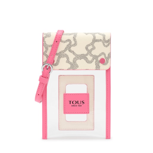 נרתיק לטלפון נייד TOUS Kaos Summer בצבע ורוד מוויניל שקוף, עם גימור הכולל עיטור מעור סינתטי לאורך השוליים החיצוניים. כולל רצועה עליונה עם ווים ניתנים לניתוק לתלייה, ותא לכרטיסים מאחור במרכז. כיסוי סוגר עשוי מעור סינתטי עם הדפס עם סגירה באמצעות שני לחצנים. מידות (גובה x רוחב x עומק): 19 x 12 x 1 ס"מ
