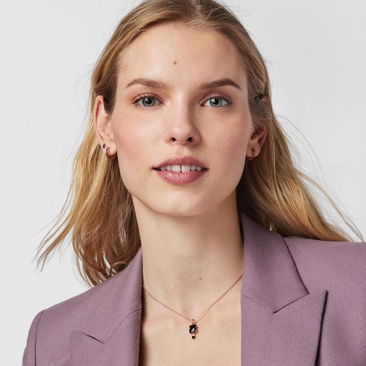 עגילי חישוק מקולקציית Motif בשיבוץ אבני ספינל שחורות ומבריקות מבית TOUS. השילוב של אבני הספינל וורמייל ורוד יוצרים ביחד את המראה הנצחי.