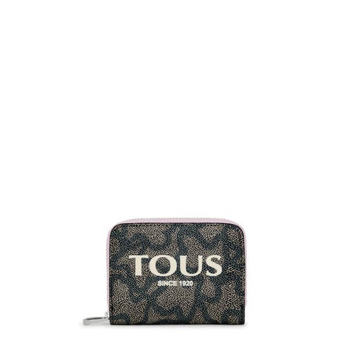 ארנק בגודל בינוני לכסף קטן TOUS Kaos Legacy, מקנבס ועם הדפס Kaos בצבע שחור. כולל גם עיטורים מעור פרה בצבע סגול. נסגר באמצעות רוכסן. כולל תא חיצוני שקוף לכרטיס או לתעודה מזהה. בחלק הפנימי יש 2 תאים פתוחים ו-2 מקומות לכרטיסים. מידות (גובה x רוחב x עומק): 8 x 11 x‏ 2 ס"מ.