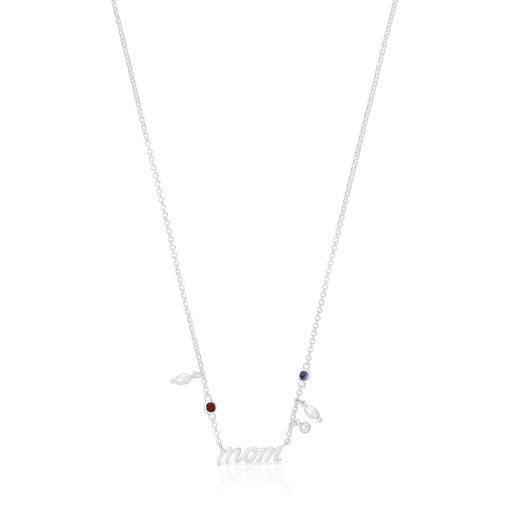 שרשרת מסדרת TOUS Mama עם מוטיב כסף סטרלינג, פנינים מתורבתות ואבני חן. גודל הפנינים המתורבתות בצורת גרגר אורז: 3 x 3.5 מ"מ. אבני חן בליטוש קבושון עגול בגודל 2.5 מ"מ: קרנליאן ואחלמה. גובה הצ'ארם: 4.5 מ"מ. אורך השרשרת: 45-42 ס"מ. סוגר טבעת קפיצי.