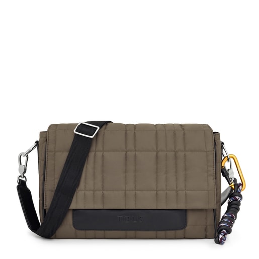 תיק צד מסדרת Empire Padded של TOUS בגודל גדול, עשוי מניילון ממוחזר בצבע חאקי עם עיטור עור סינתטי. סגירת דש עם כפתור מגנטי להידוק. כיס חזיתי פתוח וכיס פתוח בחלק הפנימי. רצועת כתף מקובעת ורצועת הצלבה נתיקה ומתכווננת. מידות (גובה x רוחב x עומק): 24 x 35.5 x 13 ס"מ.