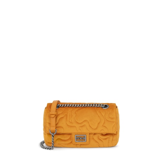 TOUS medium shoulder bag with flap from the Kaos Dream Velvet collection in padded polyurethane in the shape of bears with a mustard-colored velvet-effect finish. Long adjustable chain-type shoulder strap. Magnetic button closure. One inside zip pocket. Measurements: 12 x 32 x 21 cm.