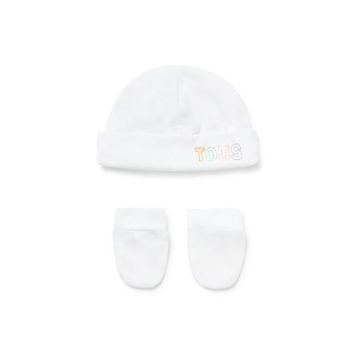 Tous Baby hat and mittens set for newborns in soft plain cotton with turn-up embroidered with multicoloured TOUS logo. Mittens with elasticated cuffs. Composition: 100% Cotton. Colour: White. OEKO/TEX* certified. Made in the EU.