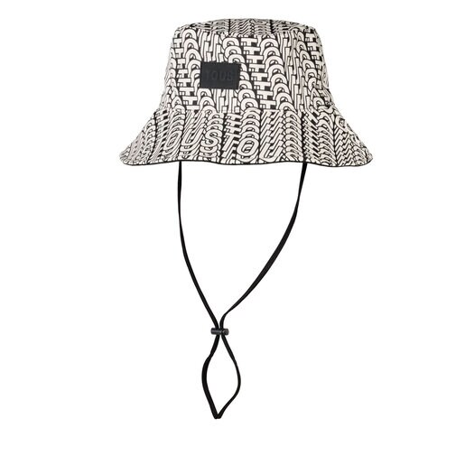TOUS Vera Doble reversible bucket-style hat with black and white print on one side and black on the other. It features an adjustable cord. Composition: 100% cotton. One size.
