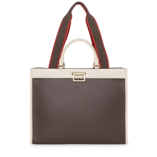 Large TOUS Kaos Legacy shopping bag in waterproof canvas with a black and beige Kaos print. It includes other details in brown, beige and red calfskin leather. It closes with a revolving gold-colored metal plate. It includes an open inner pocket and another with a zipper. It can be used in two ways, thanks to the handbag straps and the webbing shoulder strips featured. Measurements (height x width x depth): 31 x 40 x 15 cm.