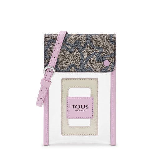 TOUS Kaos Summer mauve colored cell phone carrier in transparent vinyl, finished with synthetic leather trim along the outer edges. Includes a strap with detachable hooks at the top for hanging, and a cardholder on the center back. Flap closure in printed synthetic leather and two snap buttons for fastening. Measurements (height x width x depth): 19 x 12 x 1 cm