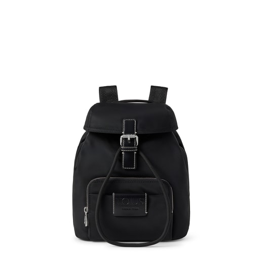 Small TOUS backpack from the Empire Soft Chain collection in black recycled nylon. Flap and fabric cord closure. Adjustable shoulder straps and short handle strap. The backpack has two pockets with zippers: one exterior and the other interior. Measurements: 14 x 24 x 26 cm.