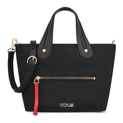 Small TOUS tote bag from the Shelby collection in leather-effect vinyl combined with black recycled nylon. Zipper closure. Adjustable and detachable crossbody strap, two handles. The handbag has 1 exterior pocket with zipper, 1 flat exterior pocket and 2 interior pockets: 1 flat and 1 with zipper. Measurements: 34 x 20 x 15 cm.
