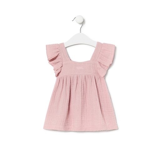 Tous Baby sleeveless dress with straight neckline, casual high waist and ruffle trim. Made in soft plain cotton. Embroidered TOUS logo below the neckline. Button fastening at the back. Composition: 100% Cotton. Colour: Pink. OEKO/TEX* certified. Made in the EU.