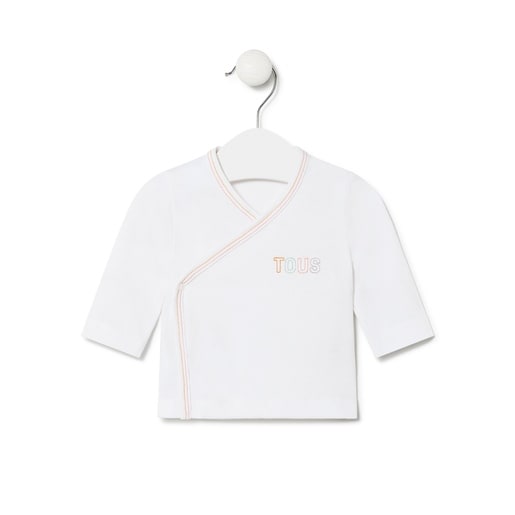 Tous Baby long-sleeved wrap-over t-shirt for newborns. Made in soft plain cotton with embroidered multicolour TOUS logo. Hems stitched in contrasting colour. Composition: 100% Cotton. Colour: White. OEKO/TEX* certified. Made in the EU.
