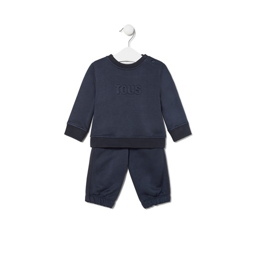 Tous Baby two-piece sweatshirt and joggers outfit: Round-necked sweatshirt with central quilted Tous logo and poppers on one shoulder. Joggers with elasticated waist, drawstring and turn-ups. Made in soft and comfortable plain fabric. Composition: 77% Viscose, 23% Cotton. Colour: Navy blue. OEKO/TEX* certified. Made in the EU.