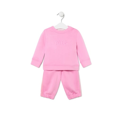 Tous Baby two-piece sweatshirt and joggers outfit: Round-necked sweatshirt with central quilted Tous logo and poppers on one shoulder. Joggers with elasticated waist, drawstring and turn-ups. Made in soft and comfortable plain fabric. Composition: 77% Viscose, 23% Cotton. Colour: Pink. OEKO/TEX* certified. Made in the EU.