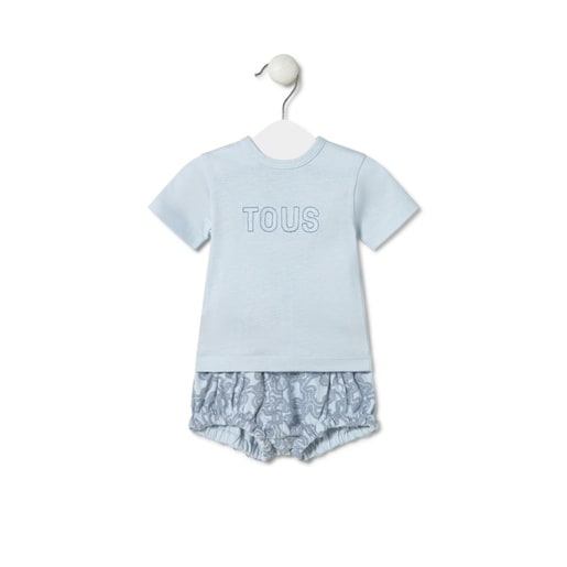 Tous Baby 2-piece set: short-sleeved, round neck t-shirt with TOUS logo below the neckline and Kaos printed bloomers. Elasticated waistband and leg cuffs on bloomers. Composition: 100% Cotton. Colour: Sky blue. Made in the EU. GREENABLE labelling: OEKO-TEX* certified. OEKO-TEX* Standard 100 fabrics are certified as having been checked at all stages of manufacture: raw materials, fibres and dyes. This certification guarantees that they do not contain materials harmful to health or the environment. Details: Wash before use, wash with similar colours, do not tumble dry, wash at 30º.