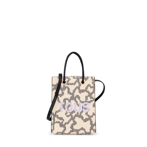 ベージュ&ブラックカラーのプリントが施されたキャンバス製ミニバッグ、TOUS Kaos Pix Pop。合成レザー製トリムも特徴的です。マグネットボタン開閉式。固定トップハンドルと取り外し&長さ調節可能なクロスボディ・ストラップ付き。サイズ(高さx幅x奥行き):21x16x6cm。