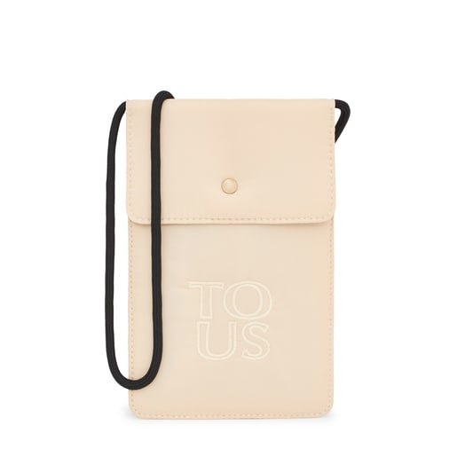 ベージュのリサイクルナイロン素材を使ったスマホポシェット、TOUS Balloon Soft。スナップボタン留めのフラップ開閉式。スライダーコードで長さを調節できるクロスボディストラップ付き。サイズ(高さx幅x奥行き):19x12.5x1cm。