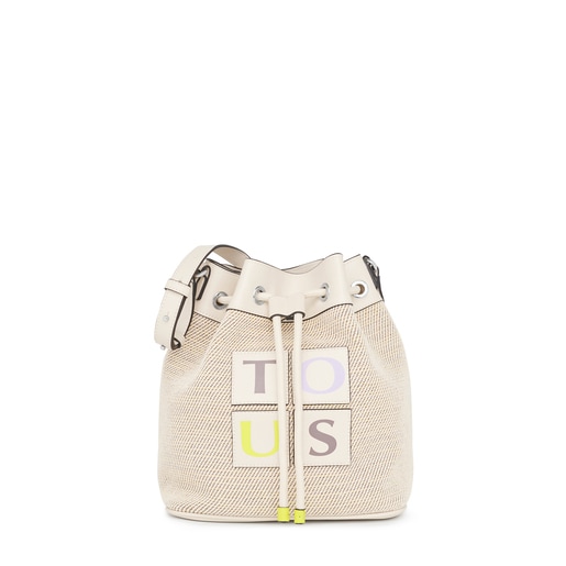 ベージュのコットン素材に合成レザーを組み合わせたバケツバッグ、TOUS Yummy。調節可能なコードで開閉します。調節可能なショルダーストラップと内側にオープンポケットが備わっています。サイズ(高さx幅x奥行き):24x23x15cm。