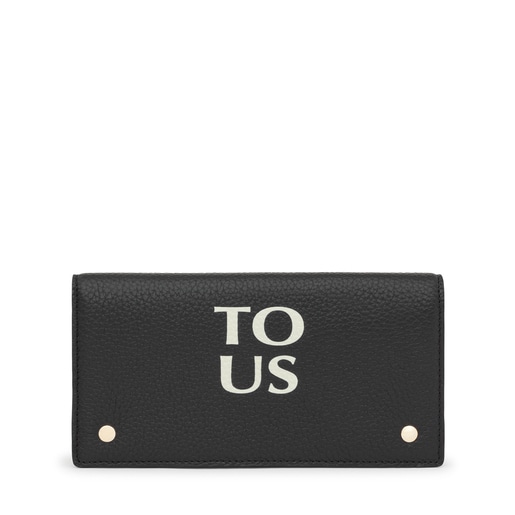 ブラックのフラットな牛革レザーウォレット TOUS Balloon。スナップボタン2つ留めのフラップ開閉式。紙幣用コンパートメント2つ、ファスナー開閉式コイン入れ1つ、カード入れ6つを備えています。サイズ(高さx幅x奥行き):10x19.5x2cm。
