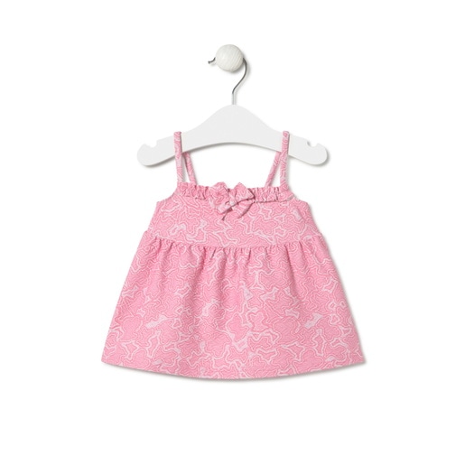 Tous Baby A-line beach dress with thin shoulder straps and straight neckline. Gathered neckline with bow. Kaos print, in soft fabric with metallic silver thread. Composition: 84% Polyamide 9% Metallic polyester 7% Elastane. Characteristics: UPF 50+ UV PROTECTION. Colour: Pink. Made in the EU. Details: Wash before use, wash with similar colours, do not tumble dry, wash at 30º.