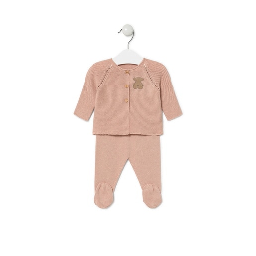 Tous Baby two-piece outfit consisting of round-necked jersey with long sleeves and ribbed leggings with elasticated waist. Made from high-quality, seamless knitted cotton to prevent any chafing of baby's delicate skin. Front closure with olive-wood buttons. Composition: 100% Cotton. Colour: Pink. Made in Spain.