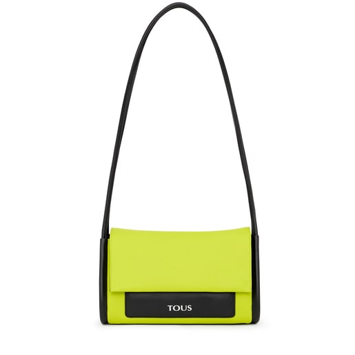 ライムカラーとブラックのフローター&ナッパのコンビネーションレザー素材、ミディアムサイズのクロスボディバッグ、TOUS Empire。マグネットボタンで留めるフラップ開閉式です。長さ固定式のロングショルダーストラップが2本備わっています。外側にオープンポケットとファスナー付きポケット。内側には中央にファスナー付きコンパートメント、オープンコンパートメント2つとオープンポケットが1つ施されています。サイズ(高さx幅x奥行き):20x30.4x13.5cm。
