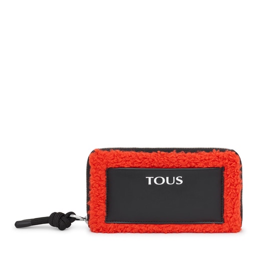 オレンジカラーのフェイクシープスキン製ファスナー開閉式ウォレット、TOUS Empire Fur。外側にオープンポケット。内側に紙幣用コンパートメント2つ、中央にファスナー開閉式コイン用ポケット1つ、カードスロット8つ付き。サイズ(高さx幅x奥行き):10x19.5x3.5cm。