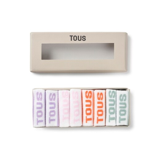 Pack of 4 pairs of Tous Baby jacquard socks with TOUS logo and stripes. Made with elastane for enhanced comfort and to help keep the socks on baby's feet. Composition: 80% Cotton 15% Polyamide 5% Elastane. Colours: pink-orange-mist-lilac. Made in the EU. Details: Wash before use, wash with similar colours, do not tumble dry, wash at 30º.