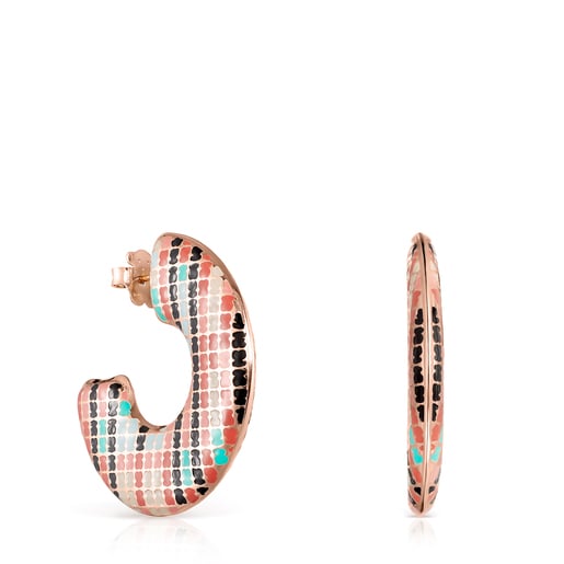 クマがプリントされたカラーエナメルが付いたローズ・ゴールドコーティングシルバーのフープピアス、TOUS Tartan disc。プッシュバック式。サイズ:4cm。(ゴールドコーティング:18kt ローズゴールドのレイヤーでメッキしたスターリングシルバー。)