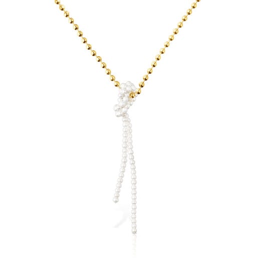 ゴールドコーティング シルバーのボールチェーン中央に、養殖パールのチェーンを結んで組みわせたネックレス、TOUS Gloss。ボールの直径:5mm。養殖パールの直径:5mm。ネックレスの長さ: 42cm。ペンダントトップの長さ:14cm。ロブスタークラスプ留め。