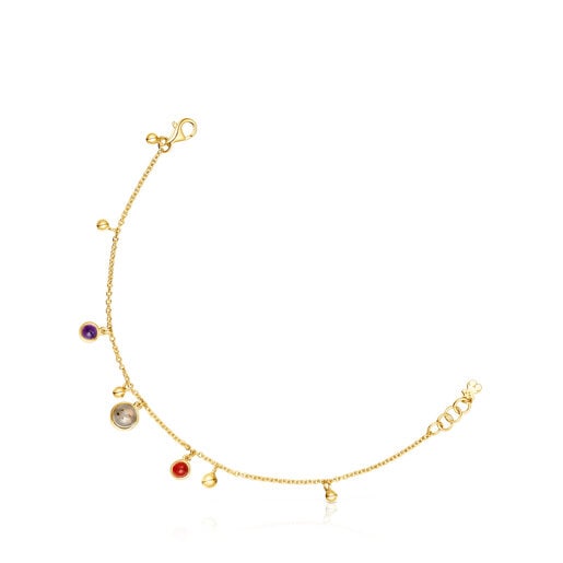 ゴールドコーティング シルバーにハンギング・チャームがあしらわれたブレスレット、TOUS Plump。3mm大のゴールドコーティング シルバーのボールシェイプのチャーム、4〜4.5mm大のカーネリアン、4〜4.5mm大のアメジスト、6〜6.5mm大のラブラドライトがあしらわれています。ブレスレットの長さ: 17.5cm。ロブスタークラスプ留め。