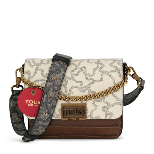 ブラウンの牛革レザーを基調にベージュビニール素材のベアプリントを組み合わせたスモールショルダーバッグ、Tous Kaos Legacy。スナップボタン留めフラップ開閉式。着脱、調節可能なチェーンスタイルのロングショルダーストラップが備わっています。内側にフラットポケット付き。サイズ:6.5x19x20cm。