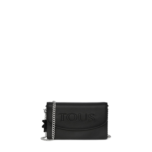 ブラックのポリウレタン素材にサフィアーノ仕上げとTOUSエンボス加工を施したスモールサイズのクロスボディバッグ、TOUS Pop。マグネットボタンが2つ備わったフラップで開閉します。チェーンスタイルのクロスボディストラップ付き。内側にフラットポケット1つ付き。ベア型ペンダントトップが備わっています。サイズ:19x12x5.5cm。