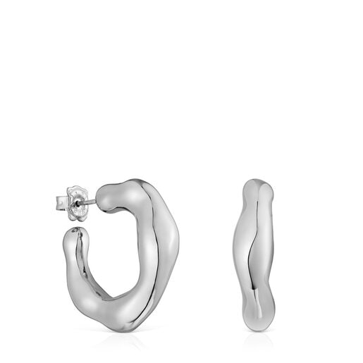 Si lo tuyo es el maximalismo, los aretes de aro en plata de primera ley de la colección TOUS Tabit se convertirán en tu joya favorita. Formas orgánicas y acabados redondeados que se adaptan a todos los estilos y ocasiones. Combínalos con lo que quieras y cuando quieras.