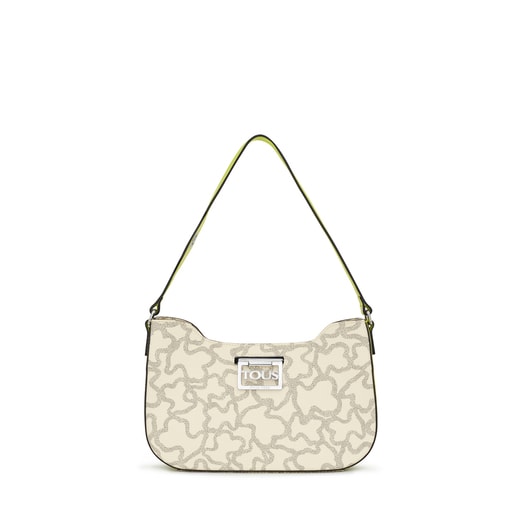 Bolso de hombro TOUS Kaos Legacy de lona con estampado Kaos en color beige. También incorpora detalles en piel vacuna de color lima. El cierre es con placa giratoria de metal. El asa viene con un ojal para poder colgar un pañuelo de adorno. Cuenta con un pequeño bolsillo interior abierto para tarjetas. Medidas (alto x ancho x fondo): 17 x 26 x 7 cm.