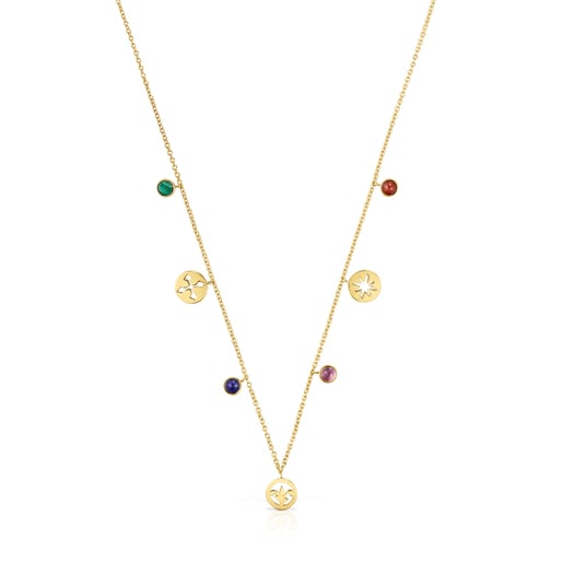 Collar Tamara Falcó X TOUS con baño de oro 18 kt sobre plata con tres medallas (flor de lis, cruz y estrella) de 8mm y malaquita, lapislazuli, amatista y rubí tratado cabujón redondo de 3,5mm. Longitud del collar: 45cm, con anilla a 42cm. Plata de primera ley recubierta de oro de 18kt con un espesor de 3 a 5 micras y sin ningún otro metal entre ambos. Técnica de producción: Fundición