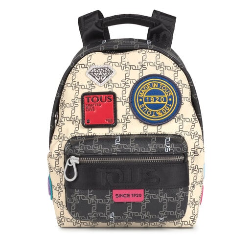 Mochila pequeña TOUS de la colección Logogram Patch de vinilo efecto piel estampado en colores beige y negro. Cierre con cremallera. Asa pequeña de mano y asas de hombro ajustables. Bolsillo interior plano. Parches conmemorativos Tous multi color. Medidas: 25x19x14 cm.