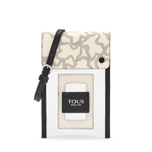 Bolsa portamóvil TOUS Kaos Summer color negro de vinilo transparente, pulido con vivo de piel sintética por los bordes exteriores. En la parte superior consta de una correa con ganchos extraíbles para colgar y un tarjetero en la parte trasera central. Cierre con solapa de piel sintética estampada y cierre con dos botones a presión. Medidas: (alto x ancho x fondo): 19 x 12 x 1 cm