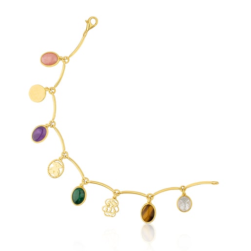 Jugar con tu pulsera y sentir que bailan todas las piezas que lucen en ella. Piedras naturales, cadena dorada y nuestros iconos. Vida y fantasía Tous en esta nueva creación.