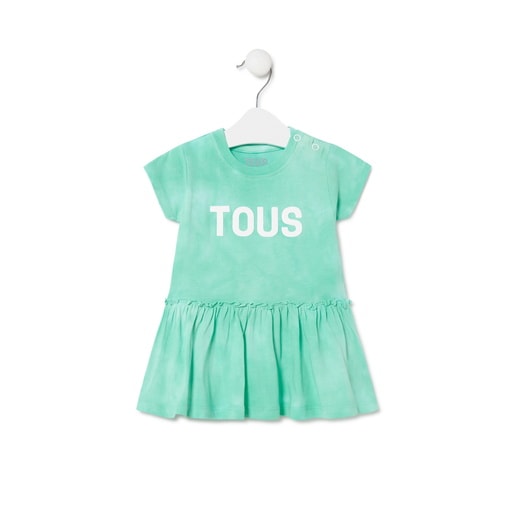 Vestido Tous Baby manga corta, cuello redondo, de suave algodón teñido tay day con logo TOUS frontal estampado. Cintura baja y falda plisada. Composición: 100% Algodón. Color: Bruma.