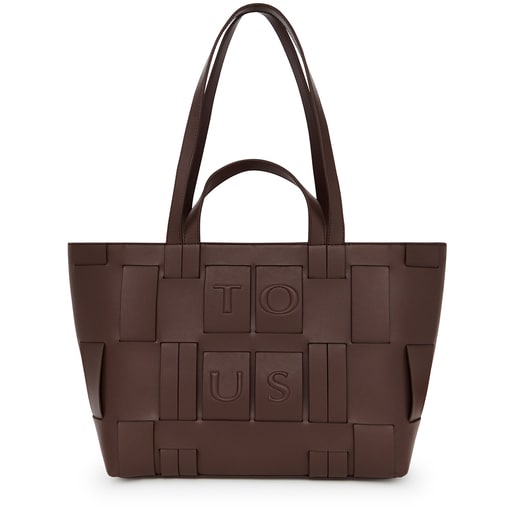 Get on board with the latest trend: handbags with braided effect and logomania. This tote bag in brown with its interlacing panels in synthetic leather belongs to the TOUS Damas collection. Refined lines for a more desired urban look.