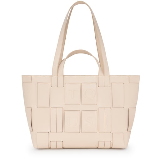 Get on board with the latest trend: handbags with braided effect and logomania. This tote bag in beige with its interlacing panels in synthetic leather belongs to the TOUS Damas collection. Refined lines for a more desired urban look.