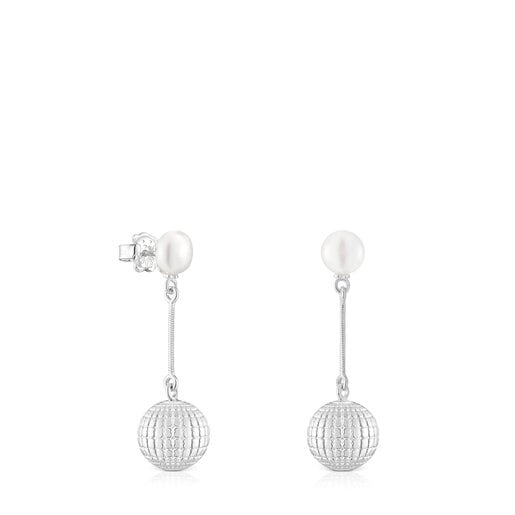 أقراط TOUS Beach Disco طويلة من الفضة مع كُرة ودباديب منقوشة بجانب لؤلؤة مستنبتة. طول القصيب: 11 مم. قطر الكرة: 12 مم.. قطر الؤلؤ: 8 مم. قفل خلفي.