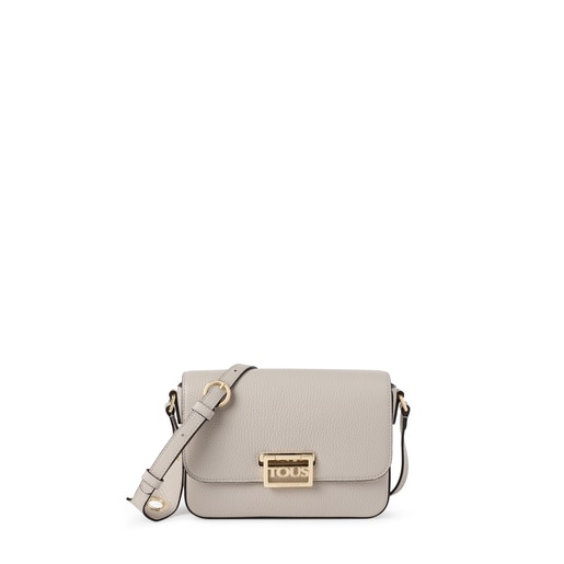 TOUS crossbody bag from the TOUS Legacy collection in beige cowhide leather. Adjustable crossbody strap, includes an eyelet for hanging a scarf for decoration. Flap closure with revolving metal plate. Measurements: 22 x 16.6 x 6 cm.