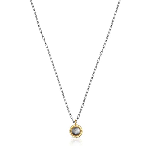 TOUS Magic Nature necklace in dark silver with 4.3 mm oval rings, a pendant with silver vermeil bezel with four 1 mm faceted round black spinels and a 6 mm moon in 0.03 ct single cut IJ/I diamonds. Pendant size: 15 mm. Necklace length: 45 cm, with ring at 40 cm. Sterling silver plated with 18kt gold with a thickness of 3 to 5 microns and with no other metal between them. (Dark Silver: Sterling silver covered with a layer of ruthenium, a mineral that gives strength and shine.) Production technique: Casting