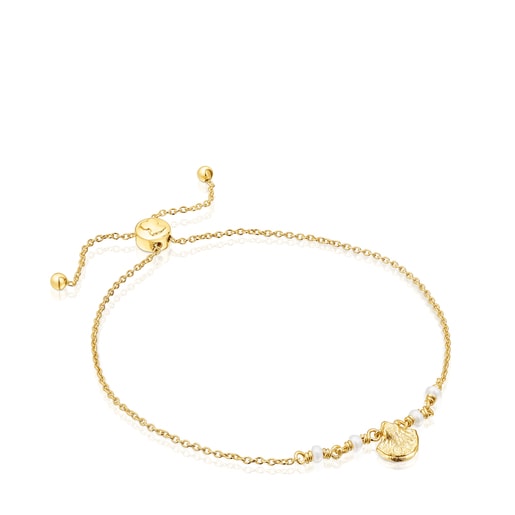 سوار TOUS Sea Vibes من فيرميل الفضة مرصع بلآلئ على شكل أزرار مستنبت في مياه عذبة وذات مقاس 3.5 مم، وصدفة مقاس 8 مم. طول يمكن تعديله من خلال مزلاق: 25.5 سم. فضة إسترلينية مطلية بطبقة من الذهب عيار 18 قيراط بسُمك من 3 إلى 5 ميكرون، مع عدم وجود أي معادن أخرى بينهما. أسلوب الإنتاج: الصب.