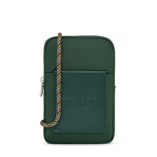 TOUS Marina cellphone case in recycled polyester with trim in green synthetic leather. Zipper closure. Open exterior pocket. Three open pockets inside. Crossbody strap, with knots for adjustment. Measurements (height x width x depth): 19 x 13 x 2 cm.